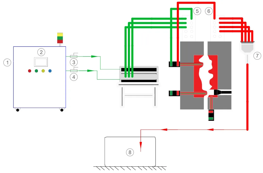 Control independiente de los circuitos de suministro de agua y aire para satisfacer las necesidades de enfriamiento de diferentes áreas del molde; monitoreo de flujo en tiempo real en zonas de puntos calientes.