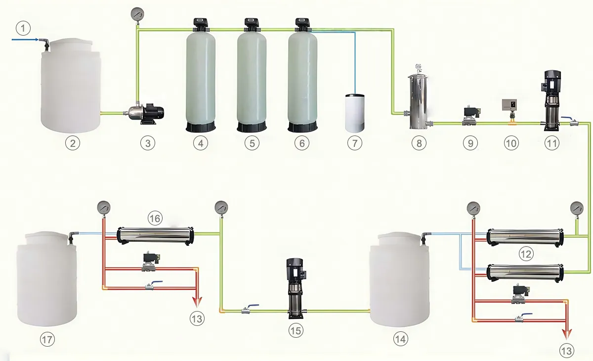 | Pretratamiento | Filtro de arena + Filtro de carbón activado + Descalcificador (sistema de dosificación antical) + Filtro de sedimentos | ||||||